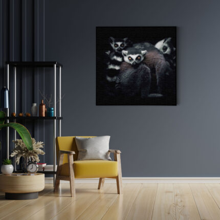 Akoestisch Schilderij Ringstaartmaki’s Met Zwarte Achtergrond Vierkant