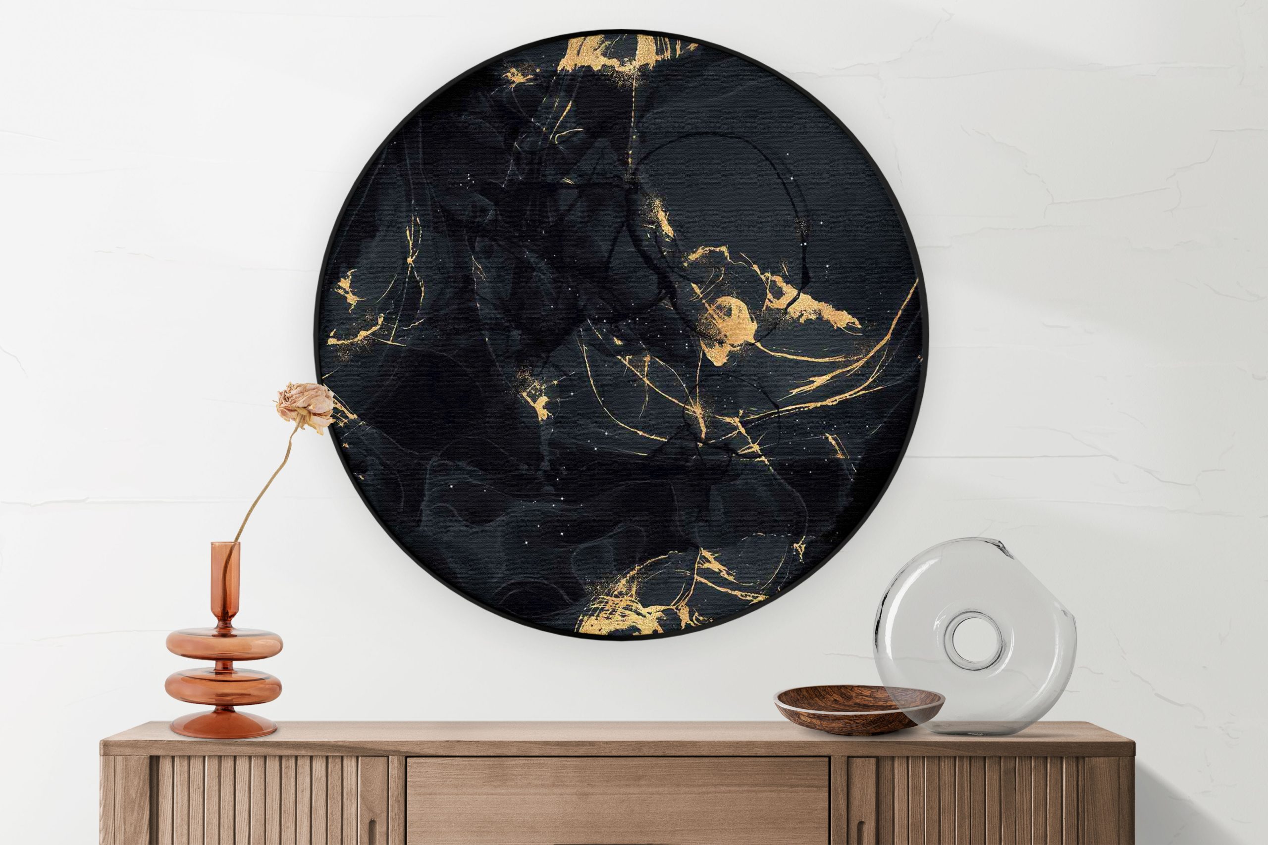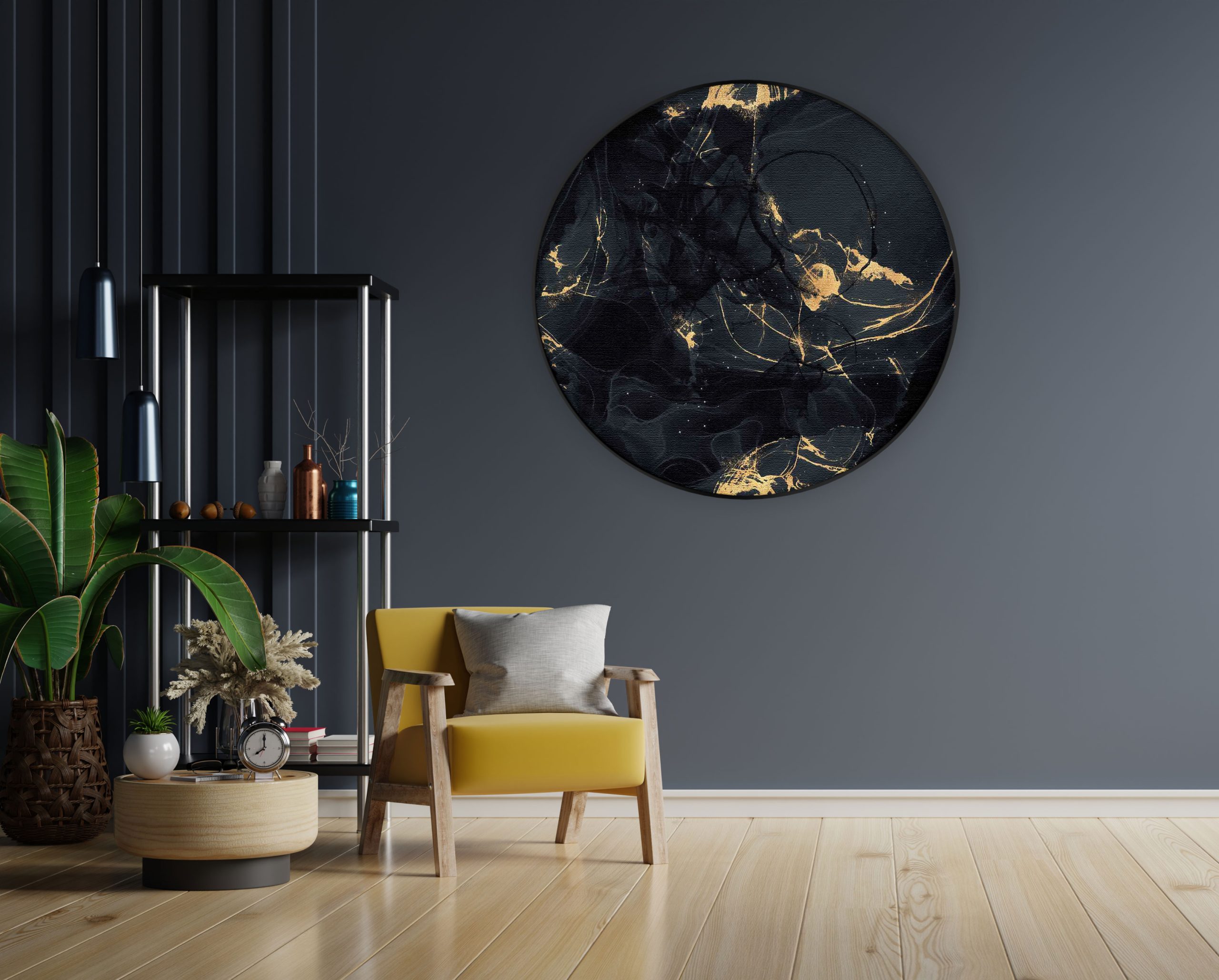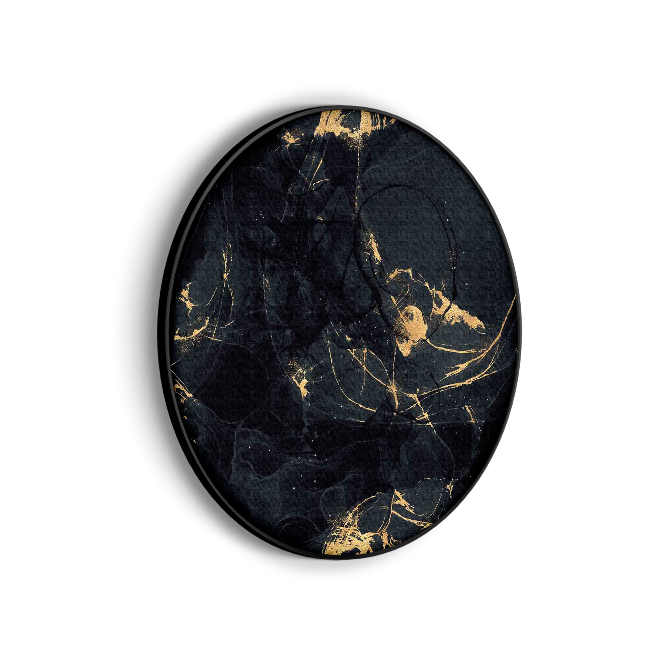 Bekijk hier het Akoestisch Schilderij Abstract Marmer Look Zwart met Goud 05Â Rond.