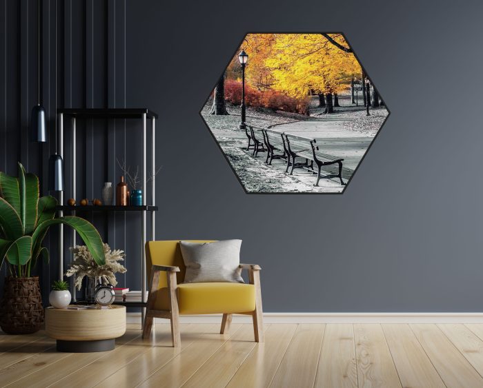 Bekijk hier het Akoestisch Schilderij Gele herfst Hexagon.