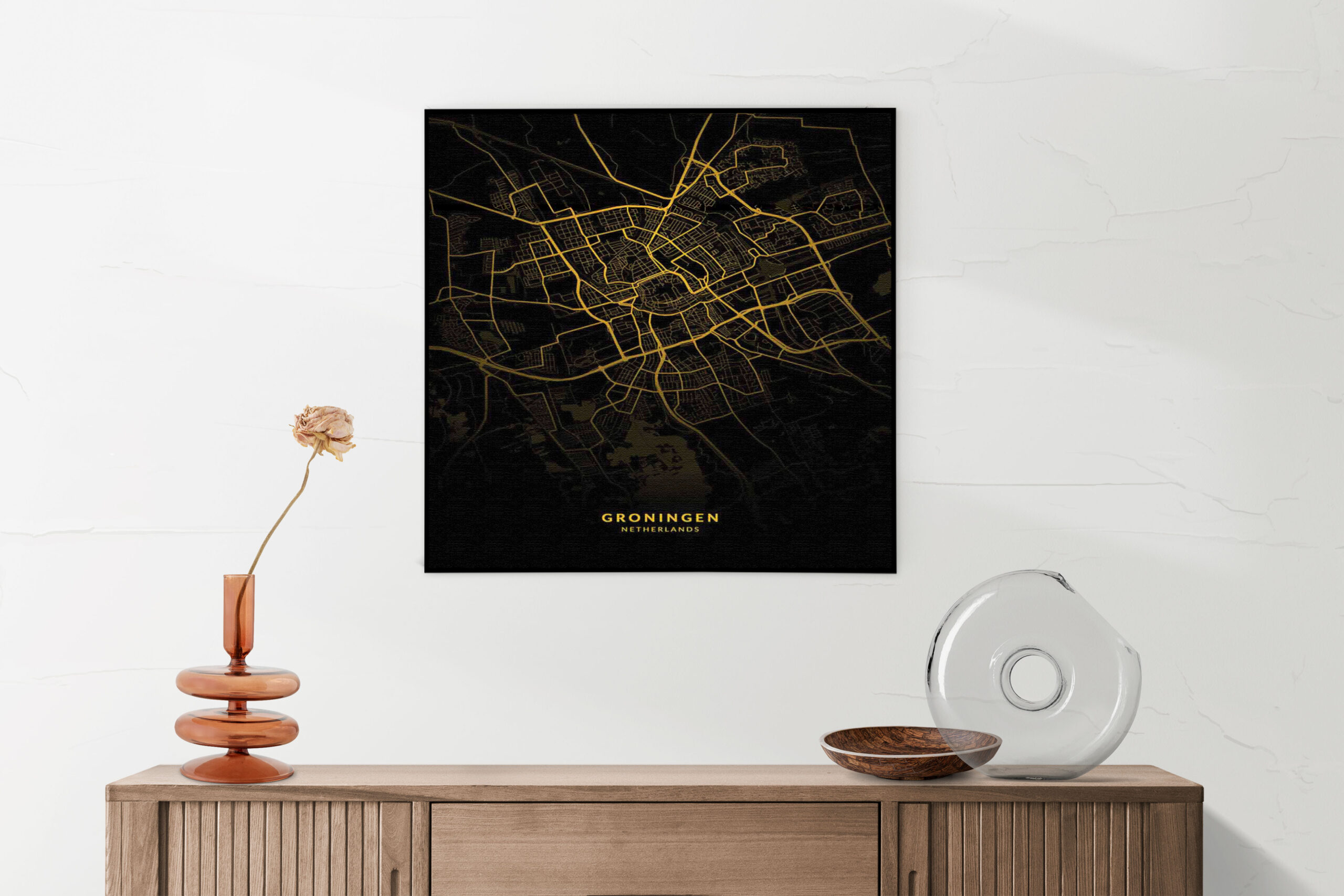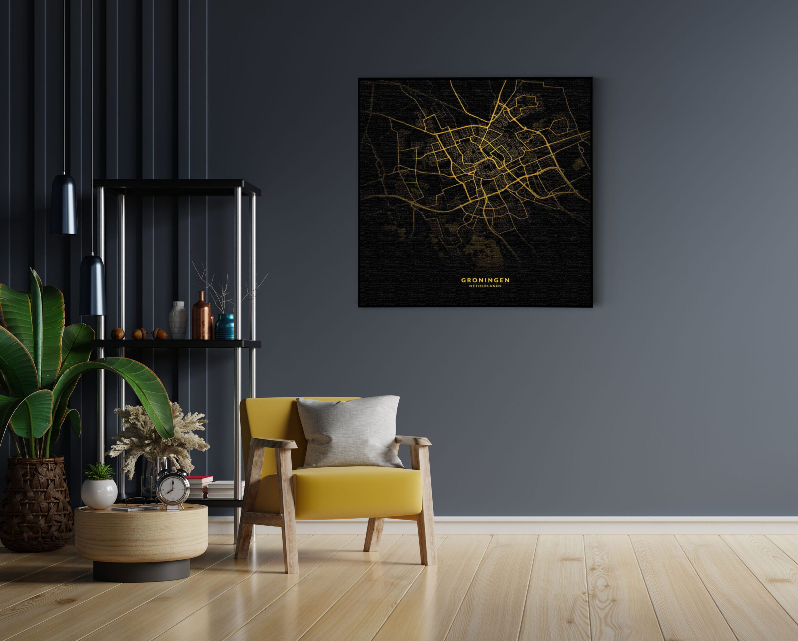 Bekijk hier het Akoestisch Schilderij Groningen Plattegrond Zwart Geel Vierkant.