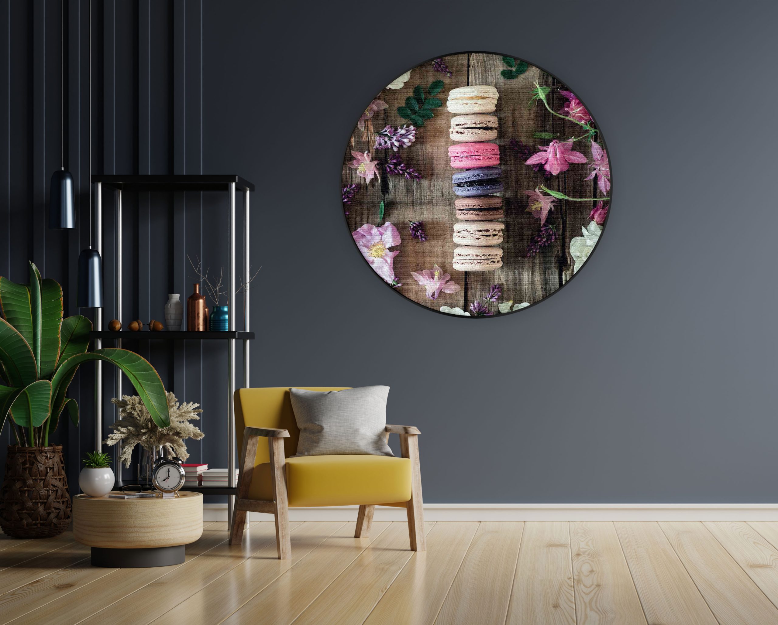 Bekijk hier het Akoestisch Schilderij Macarons op Bloemen Tafel Rond.