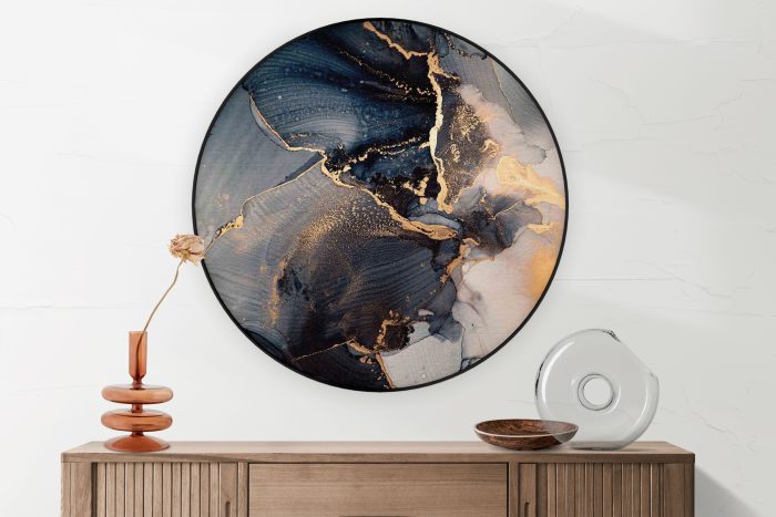 Bekijk hier het Akoestisch Schilderij Marmer Look Chique Donker Blauwtinten met Goud 01Â Rond.