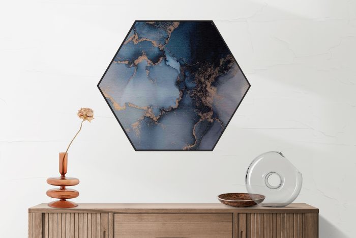 Bekijk hier het Akoestisch Schilderij Marmer Look Chique Donker Blauwtinten met Goud 03Â Hexagon.