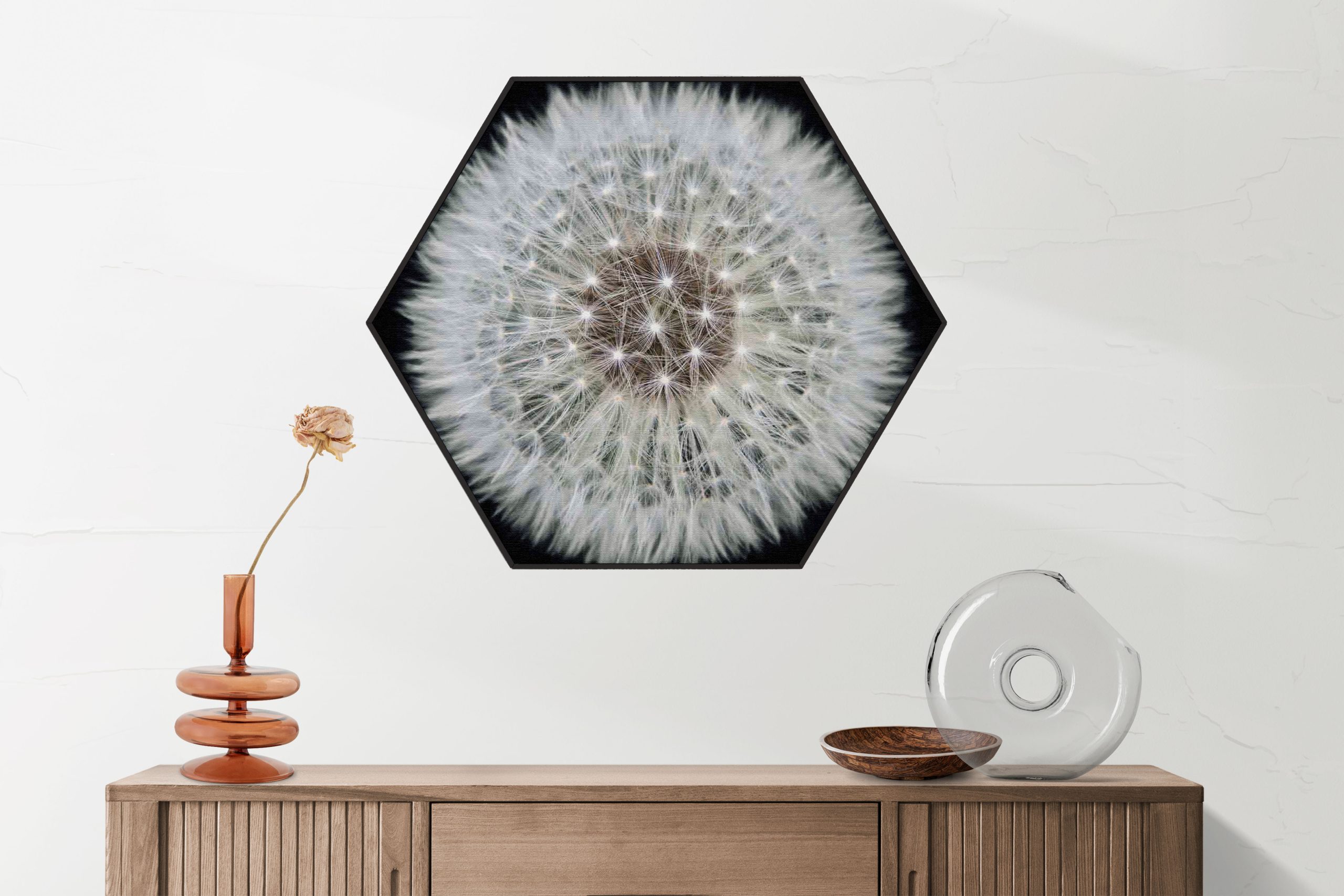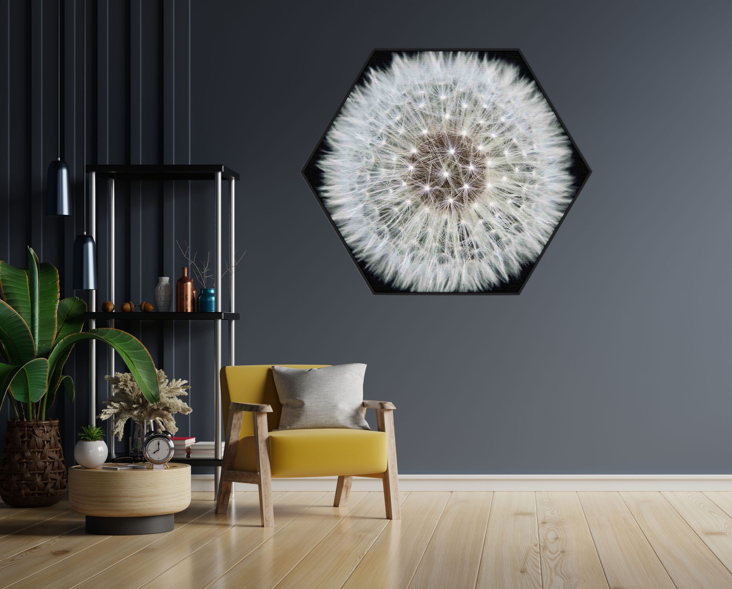 Bekijk hier het Akoestisch Schilderij Pluis van paardenbloem Hexagon.
