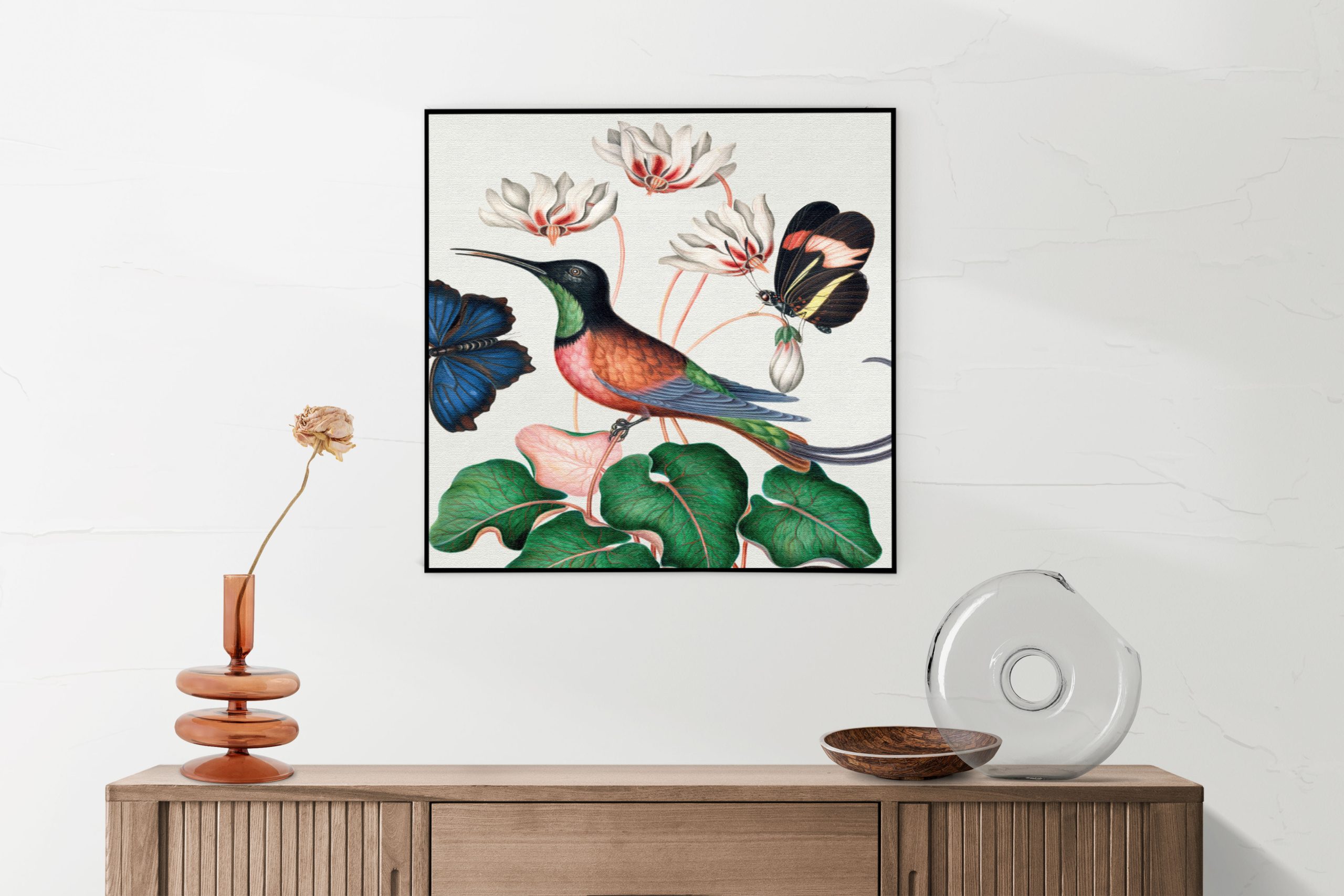 Bekijk hier het Akoestisch Schilderij Prent Natuur Vogel en Bloemen 07Â Vierkant.