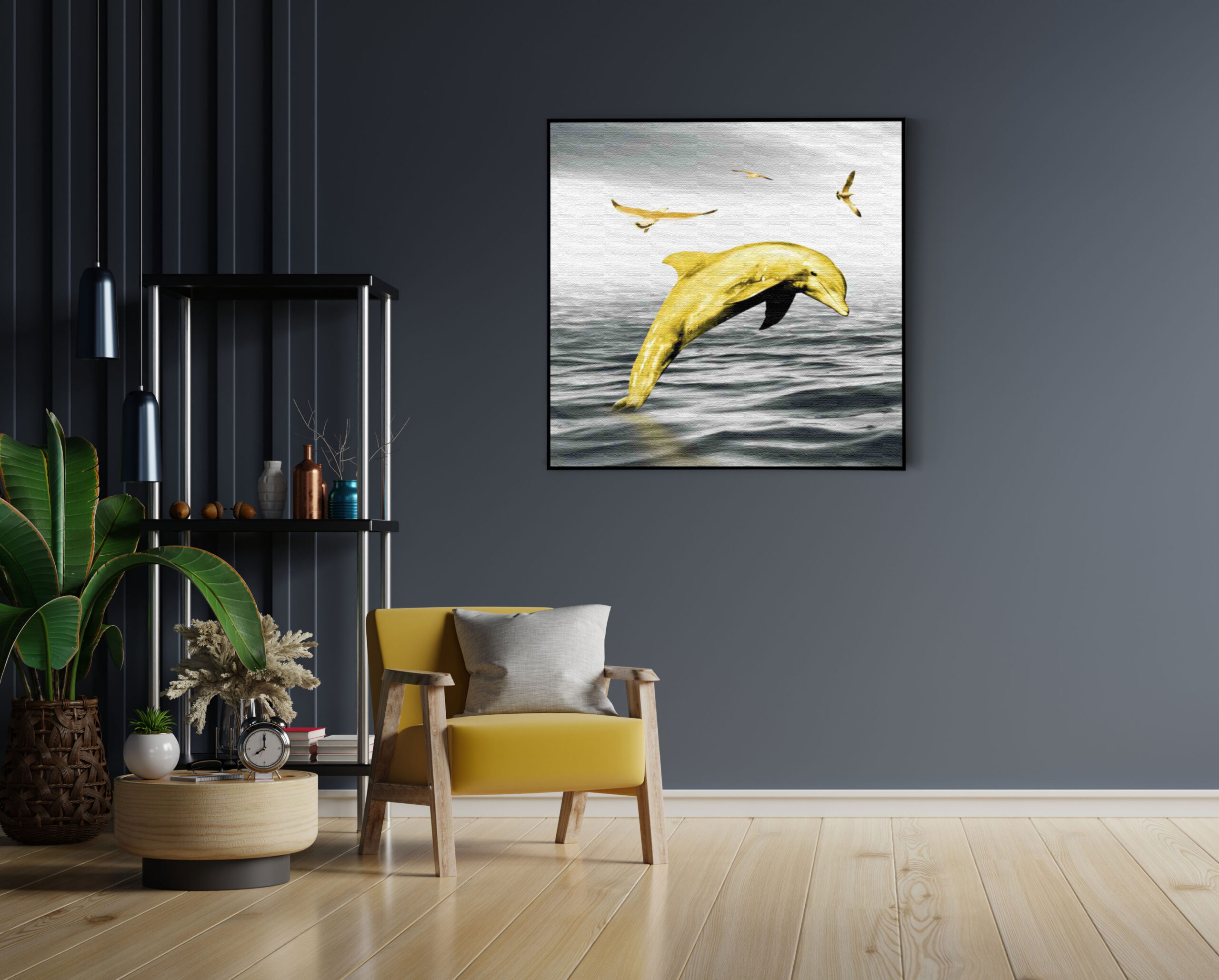 Bekijk hier het Akoestisch Schilderij Springende Dolfijnen Goud 02 Vierkant.
